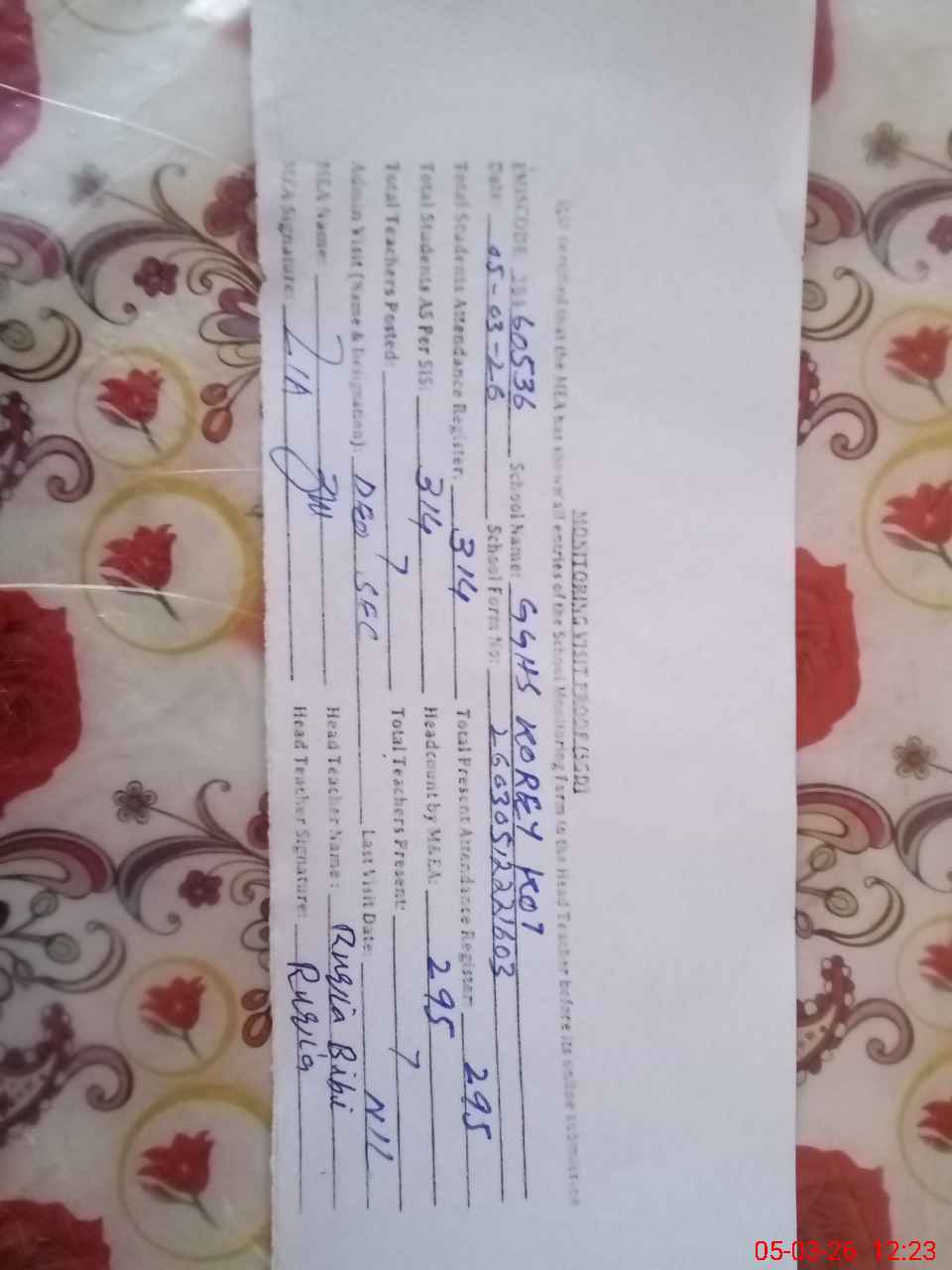 | Attendance Register | Head Teacher | MEA with School | Visit Proof |