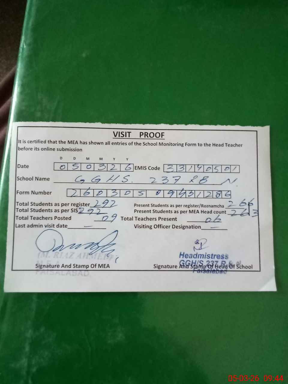 | Attendance Register | Head Teacher | MEA with School | Visit Proof |