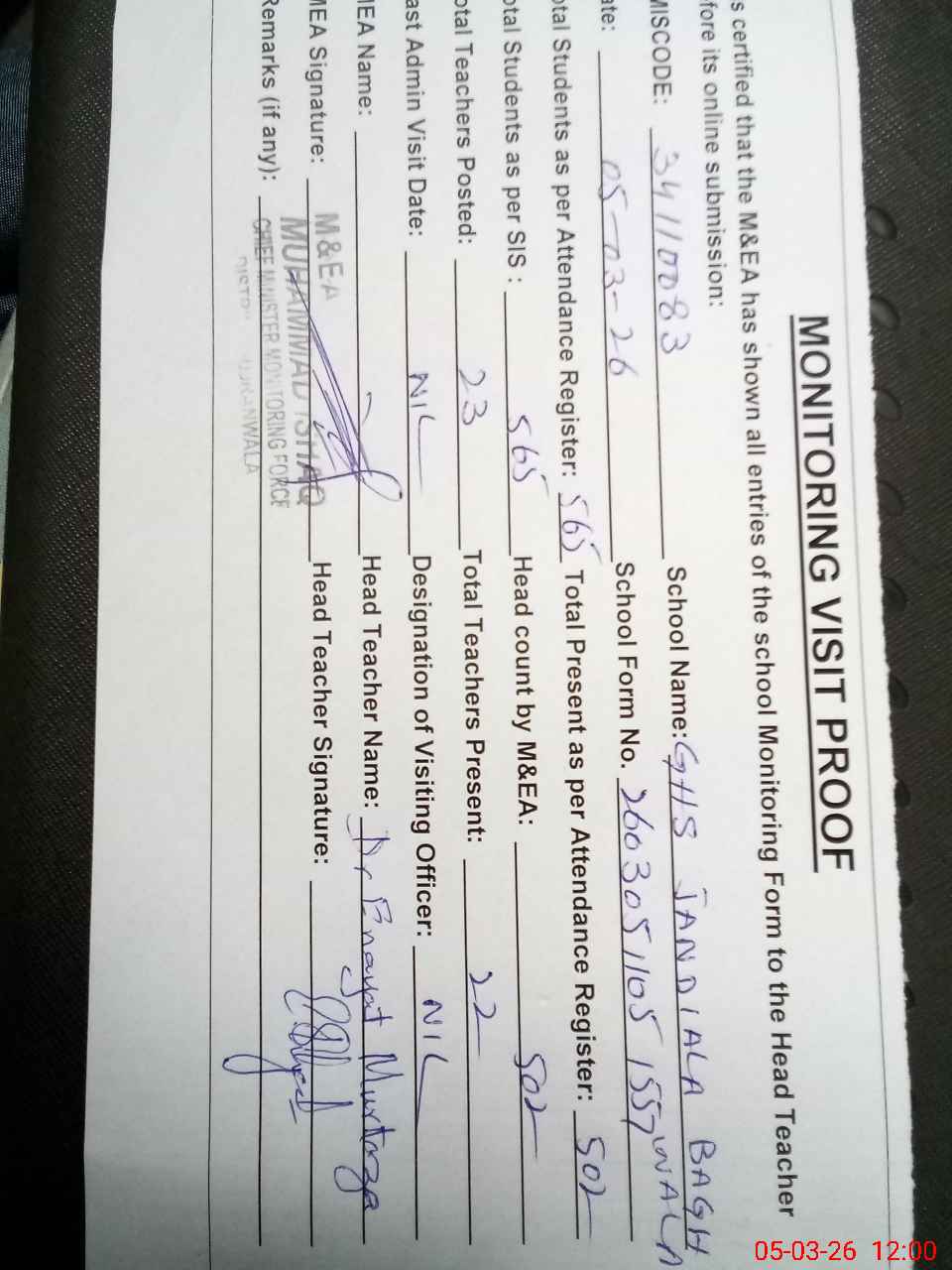 | Attendance Register | Head Teacher | MEA with School | Visit Proof |