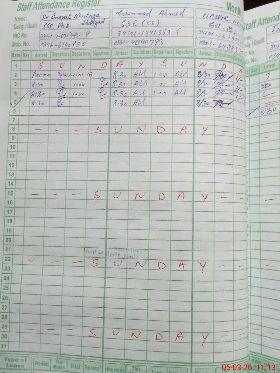 | CNIC | Full Name | Designation | R/C | Absence During Last Calender Month |
