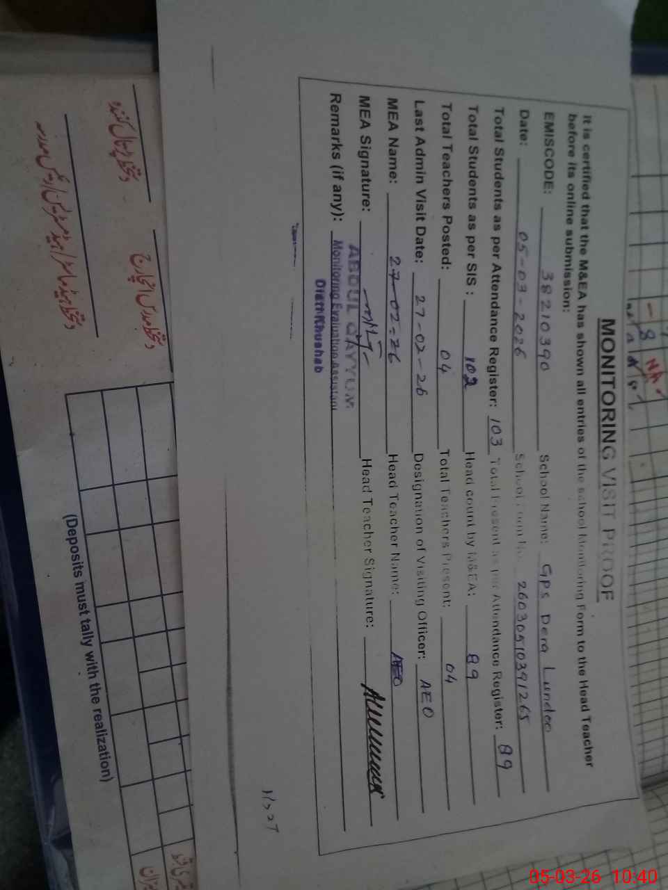 | Attendance Register | Head Teacher | MEA with School | Visit Proof |