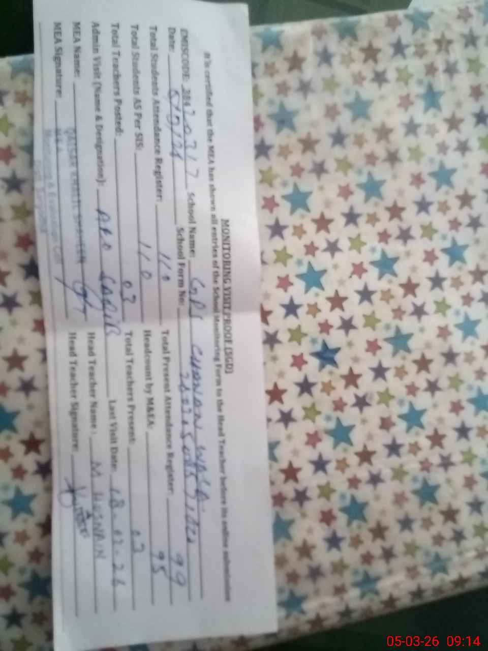 | Attendance Register | Head Teacher | MEA with School | Visit Proof |