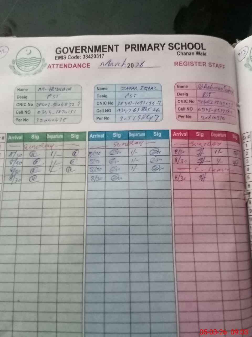 | Name: MU**** HU**** Designation: (School Headmaster's/Headmistress's) PST Phone/Cell Number: 03**** |