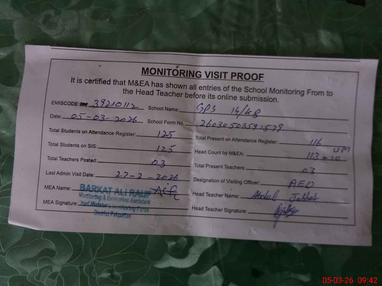 | Attendance Register | Head Teacher | MEA with School | Visit Proof |