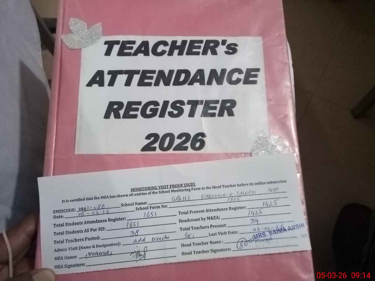 | Attendance Register | Head Teacher | MEA with School | Visit Proof |