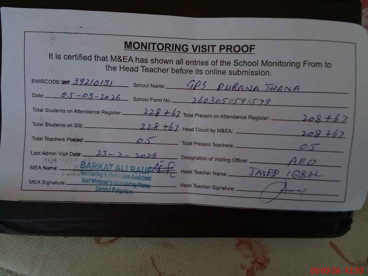 | EMIS Code: 39210131 | Name of School: GPS PURANA THANA | |||