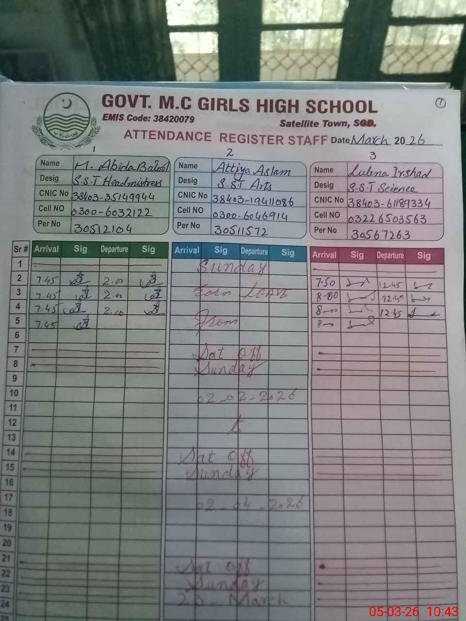 | Name: AB**** BA**** Designation: (School Headmaster's/Headmistress's) I/C HEADMISTRESS Phone/Cell Number: 03**** |