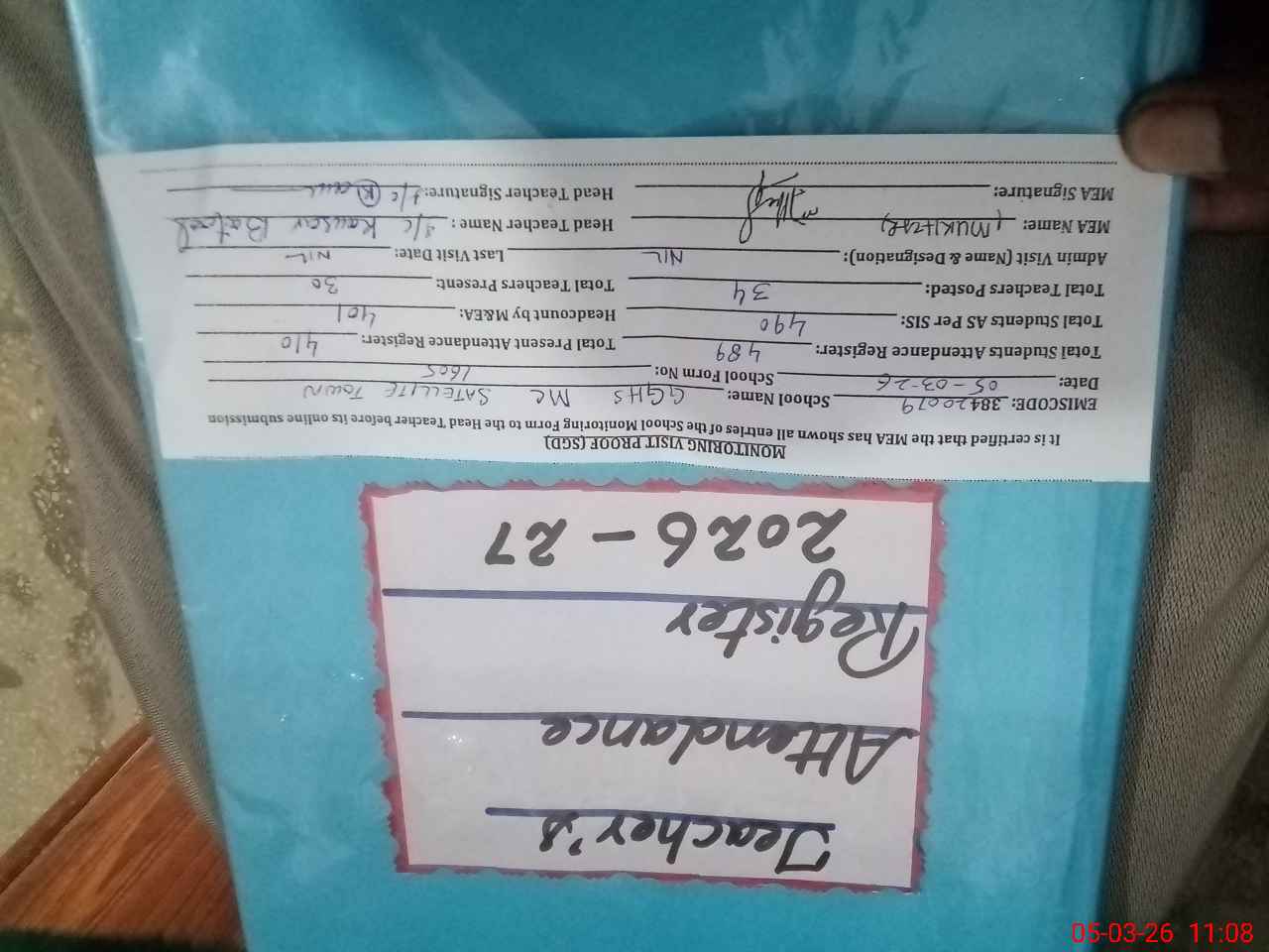 | Attendance Register | Head Teacher | MEA with School | Visit Proof |