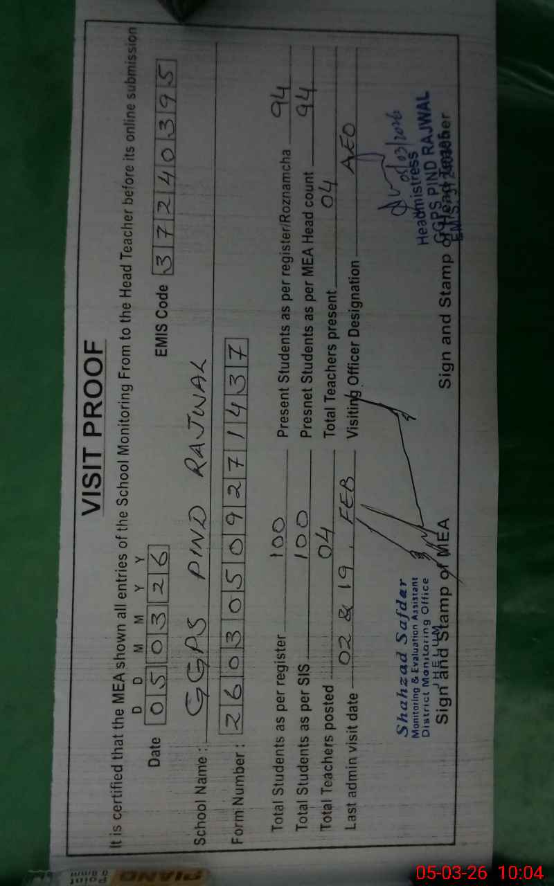 | EMIS Code: 37240395 | Name of School: GGPS PIND RAJWAL | |||