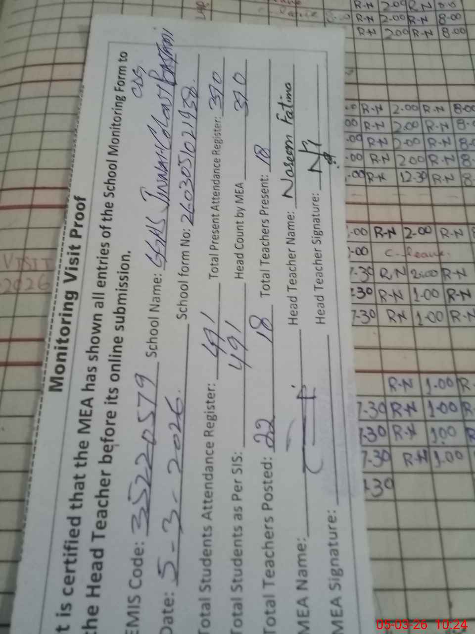 | Attendance Register | Head Teacher | MEA with School | Visit Proof |