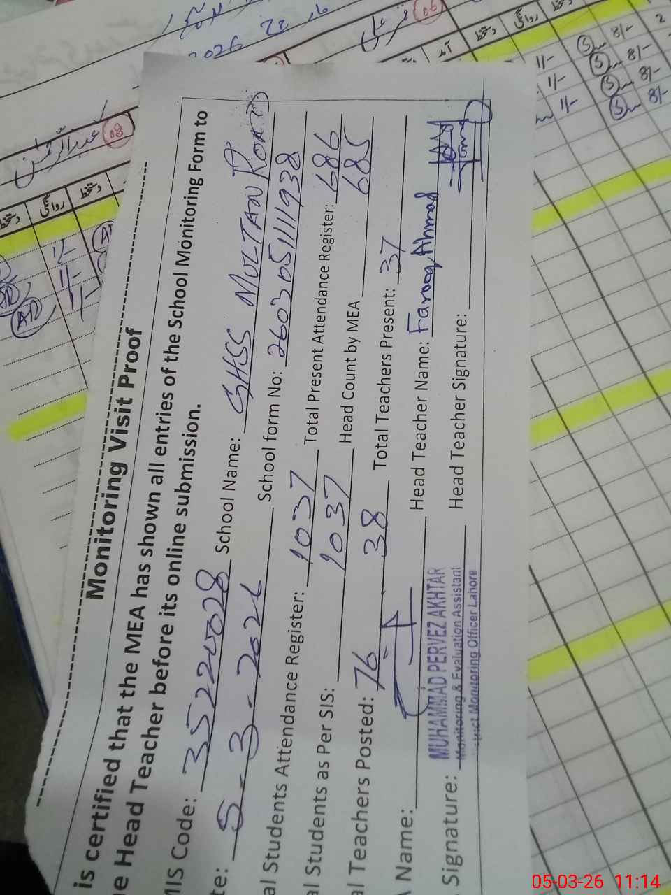 | EMIS Code: 35220028 | Name of School: GHSS ISLAMIA MULTAN ROAD | |||