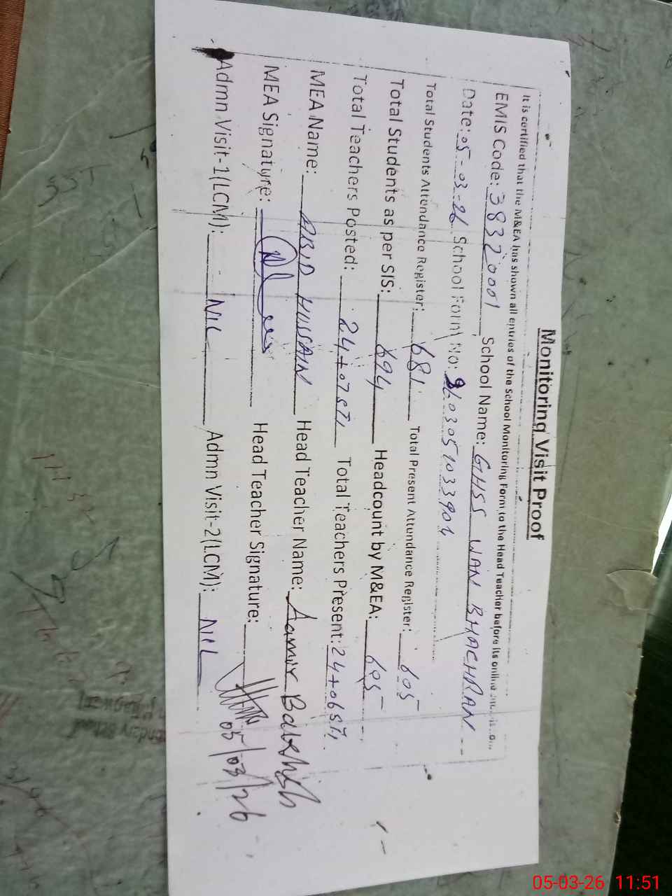| Attendance Register | Head Teacher | MEA with School | Visit Proof |