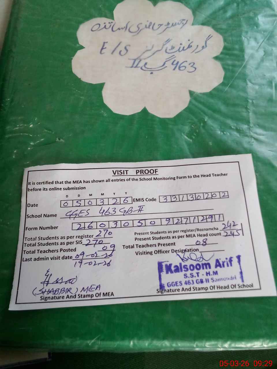 | Attendance Register | Head Teacher | MEA with School | Visit Proof |
