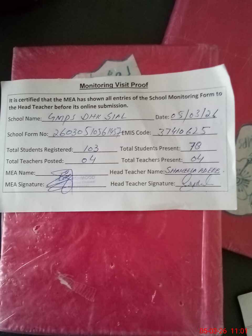 | Attendance Register | Head Teacher | MEA with School | Visit Proof |