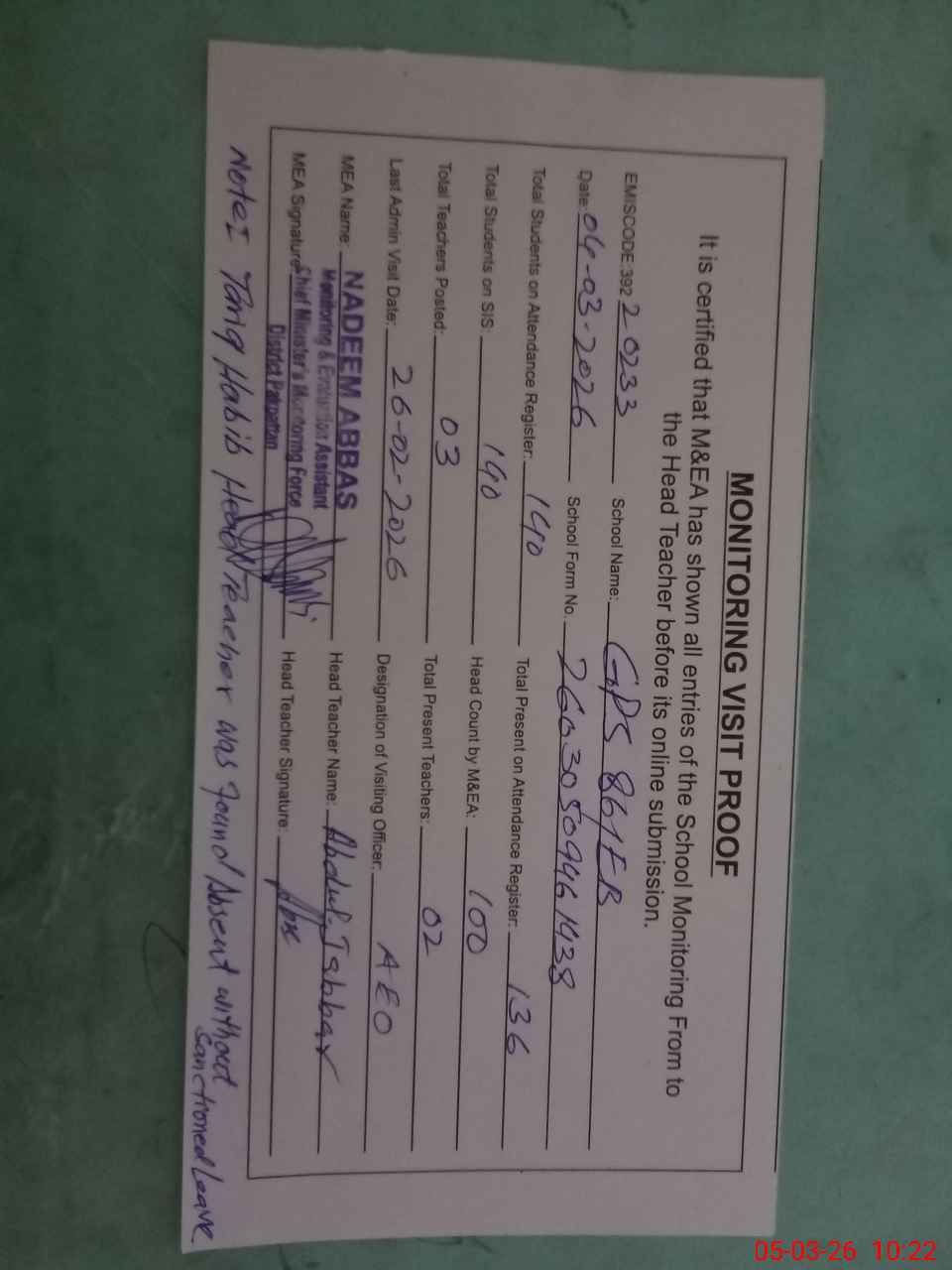 | Remarks (Use Separate Page if Required): Note NSB record was not updated Head teacher Tariq Habib was found absent without sanctioned leave 02 washrooms was found locked classroom condition was found poor No security Gard hired by school Free text books record was not shown soap was found poor | |||||