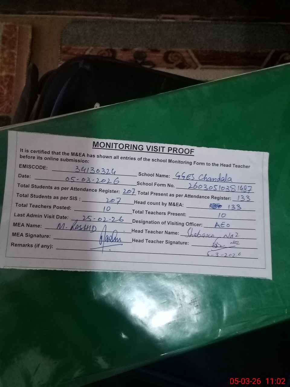 | Attendance Register | Head Teacher | MEA with School | Visit Proof |
