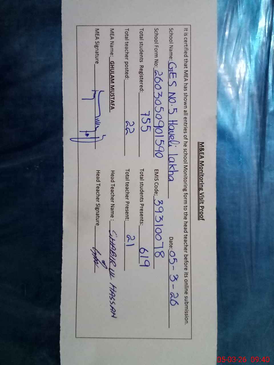 | Attendance Register | Head Teacher | MEA with School | Visit Proof |