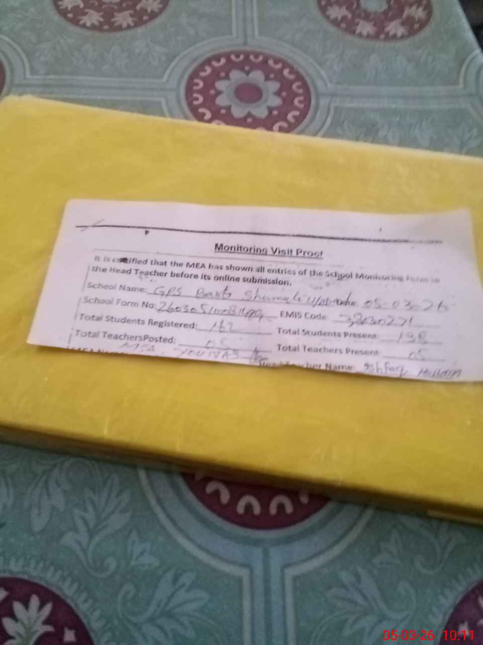 | Attendance Register | Head Teacher | MEA with School | Visit Proof |
