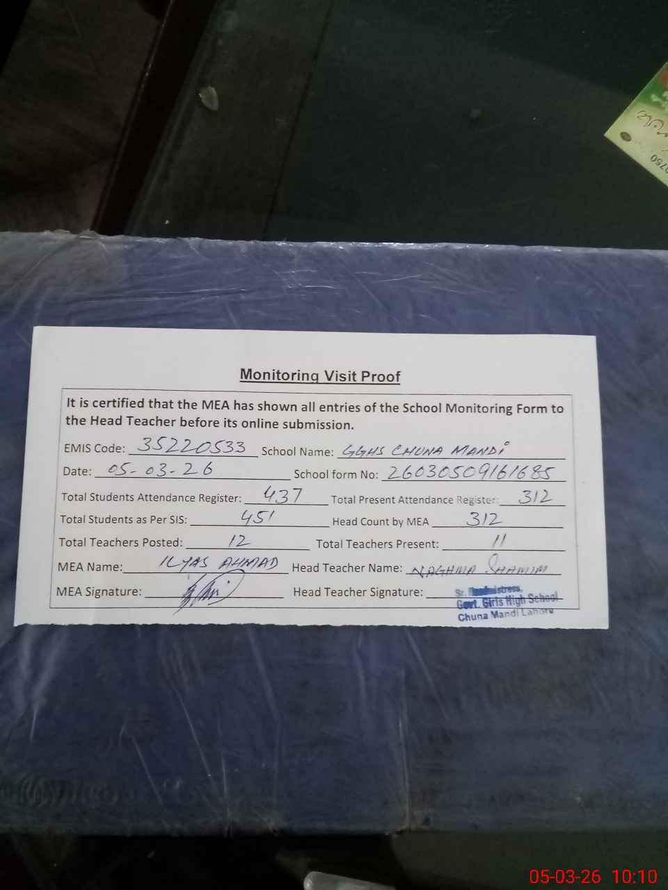 | Attendance Register | Head Teacher | MEA with School | Visit Proof |