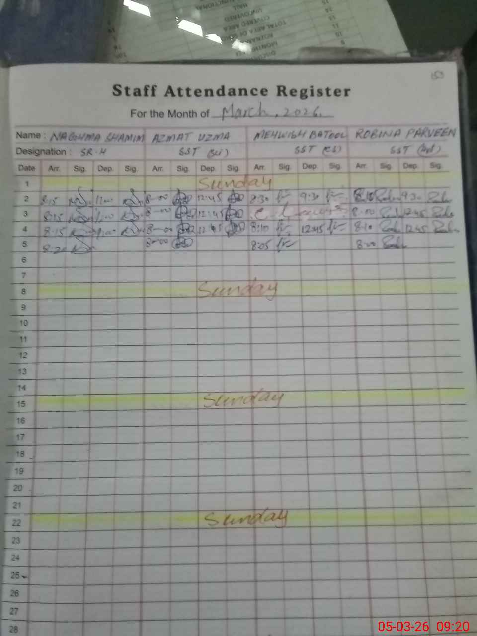 | Remarks (Use Separate Page if Required): Teacher Saira Munir is marked absent today as medical leave wef 26 February 2026 for 30 days has not been approved so far JC Umer Aftab is marked absent today as physical not available in School also attendance column left blank | |||||
