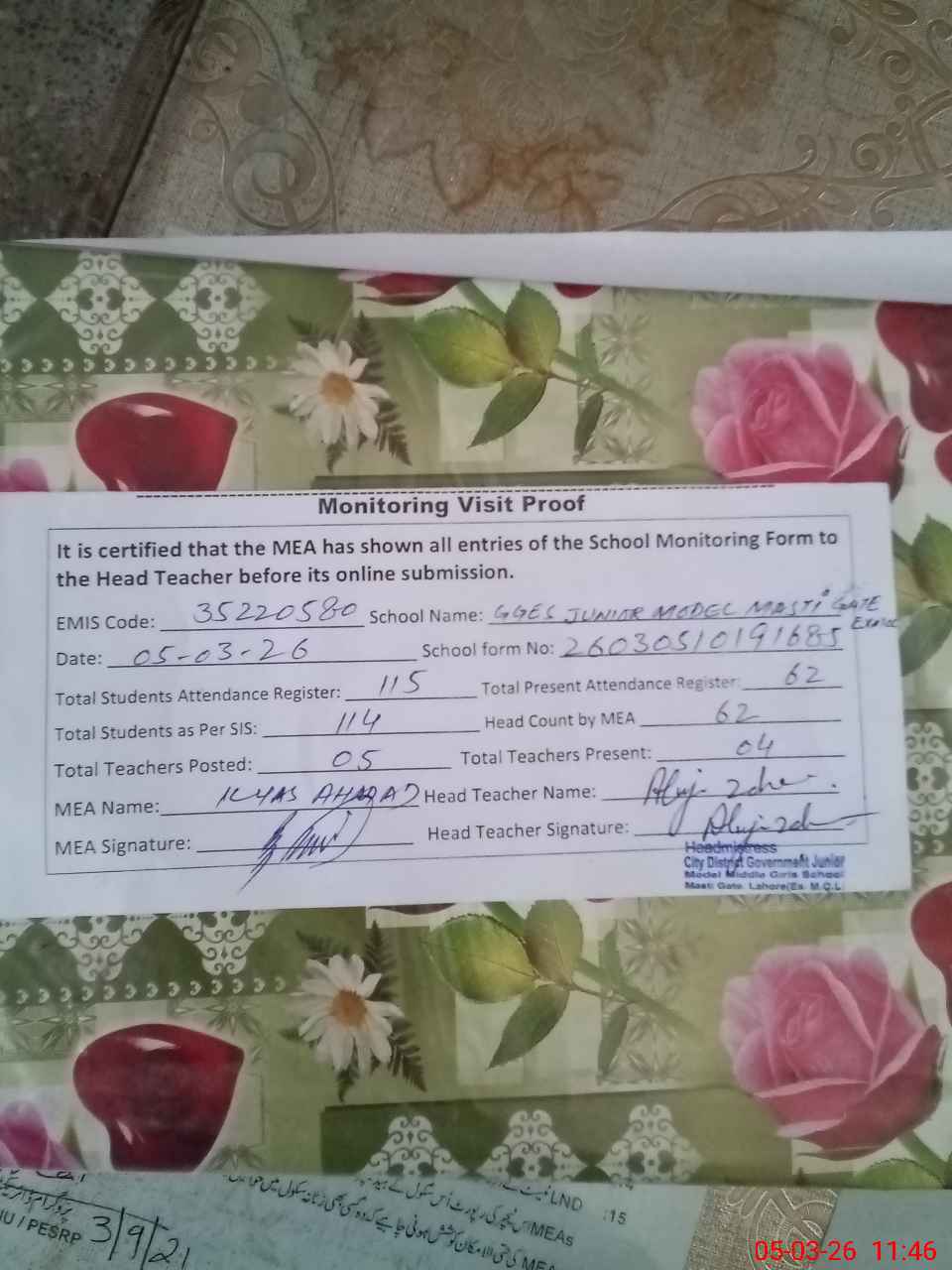 | Attendance Register | Head Teacher | MEA with School | Visit Proof |