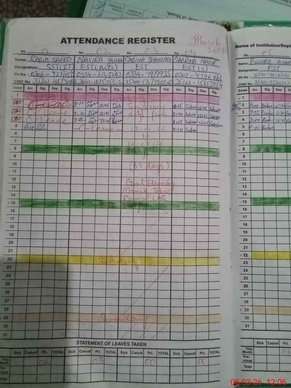 | CNIC | Full Name | Designation | R/C | Absence During Last Calender Month |