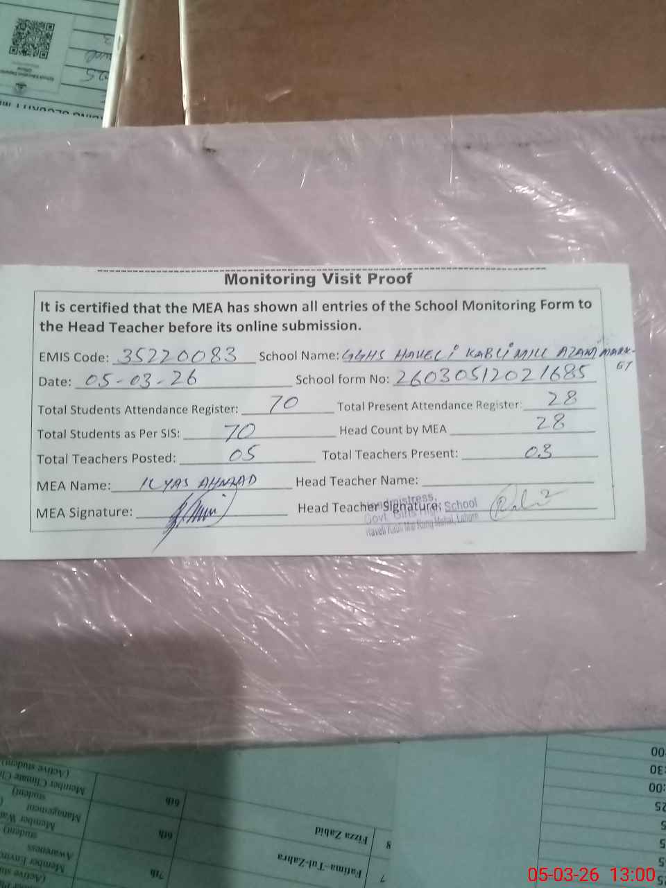 | Attendance Register | Head Teacher | MEA with School | Visit Proof |