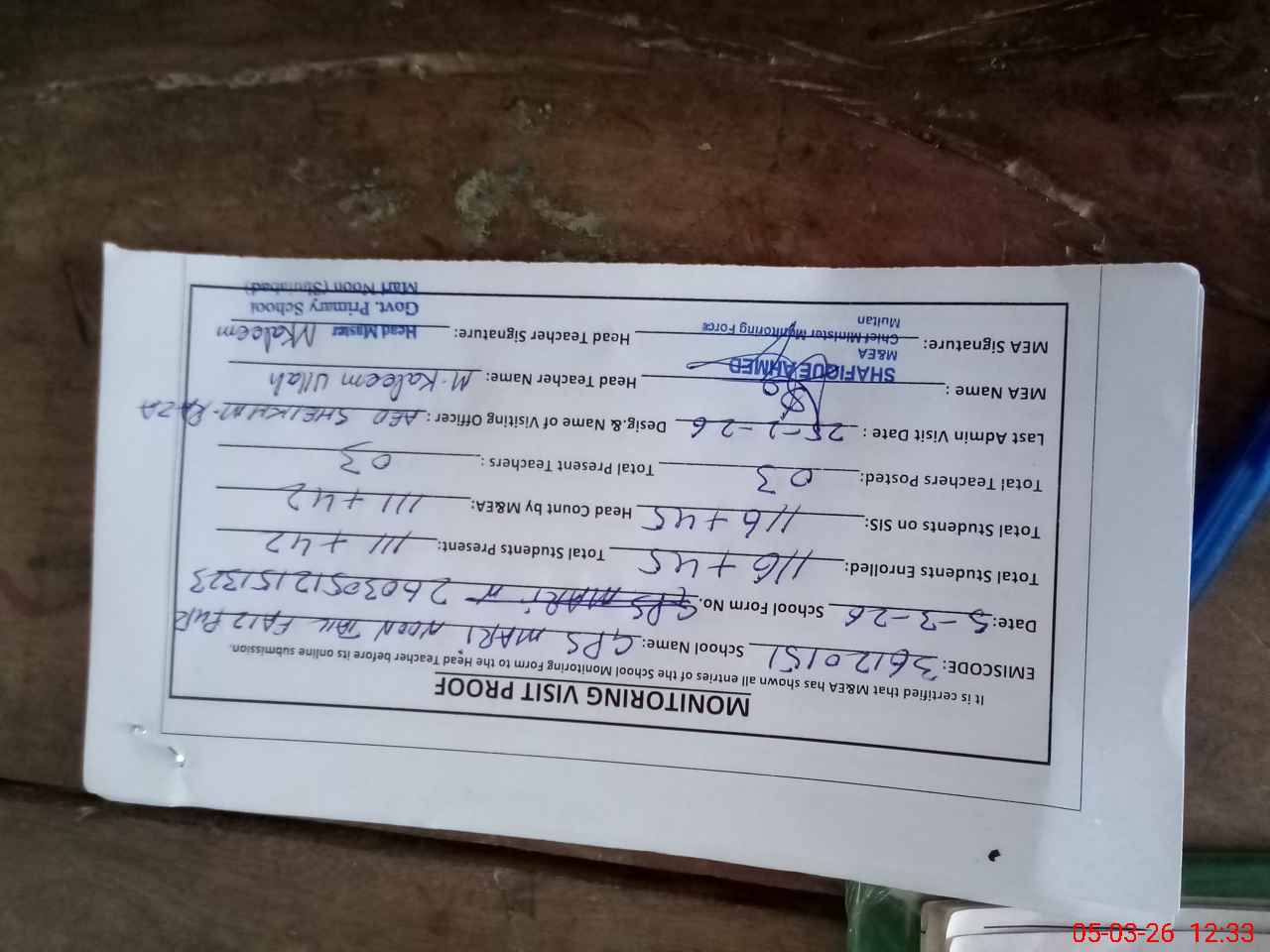 | EMIS Code: 36120151 | Name of School: GPS MARI NOON TAIL FAIZ PUR | |||