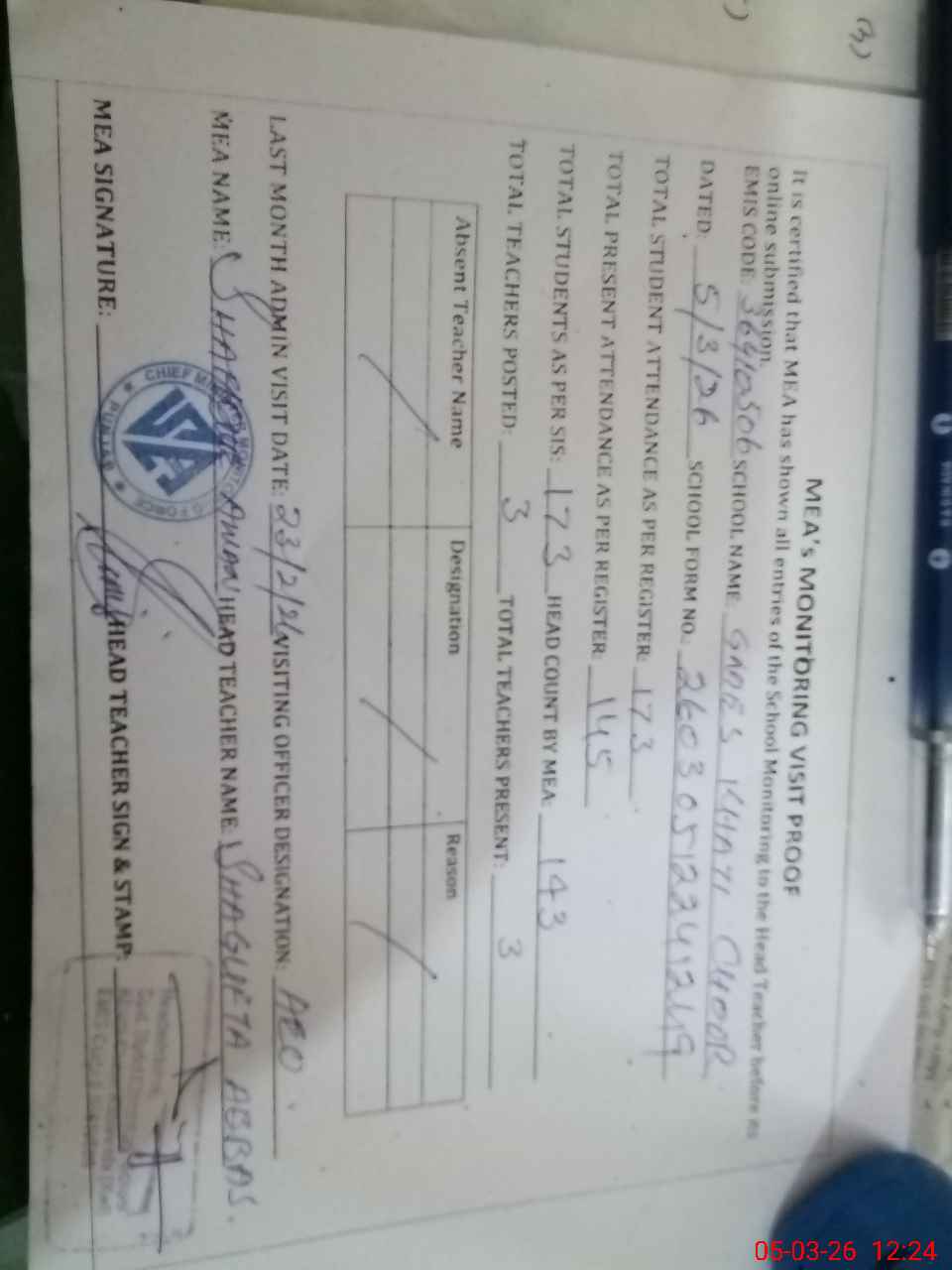 | Attendance Register | Head Teacher | MEA with School | Visit Proof |