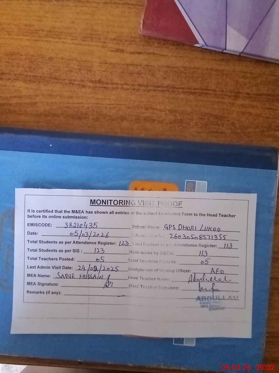 | Remarks (Use Separate Page if Required): no teacher absent total students on register 123 total students on SiS 123 last admin visit by AEO on 24 Feb 2026 | |||||