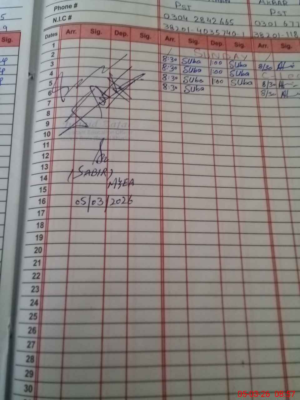 | CNIC | Full Name | Designation | R/C | Absence during last cal. month |