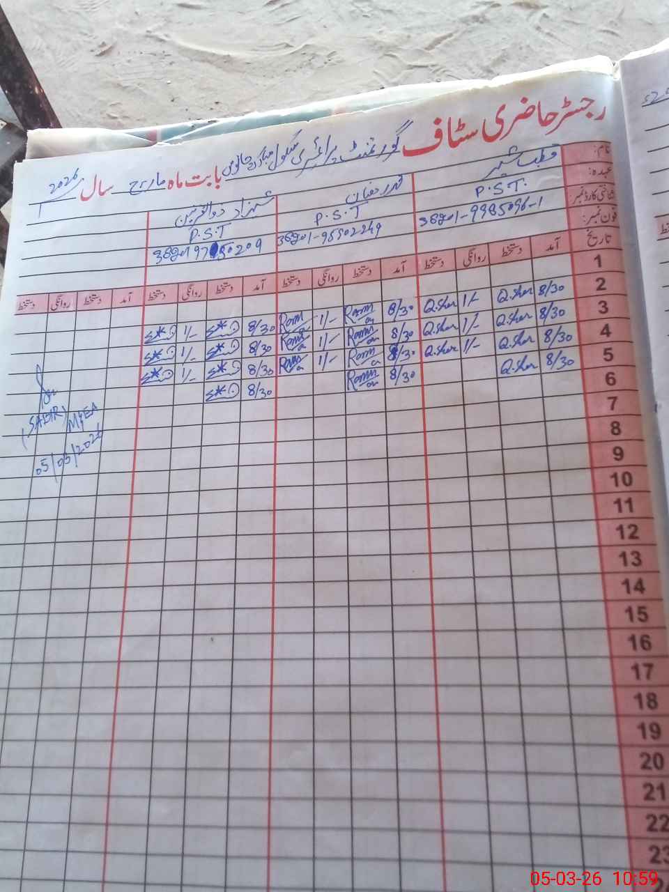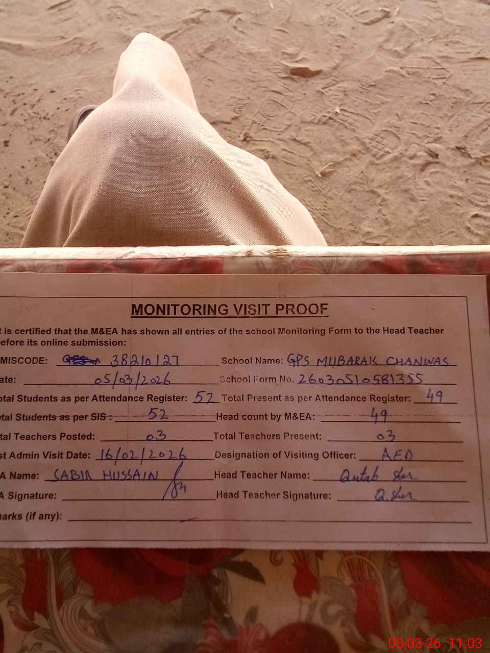 | Remarks (Use Separate Page if Required): no teacher absent total students on register 52 total students on SiS 52 last admin visit by AEO on 16 Feb 2026 | |||||