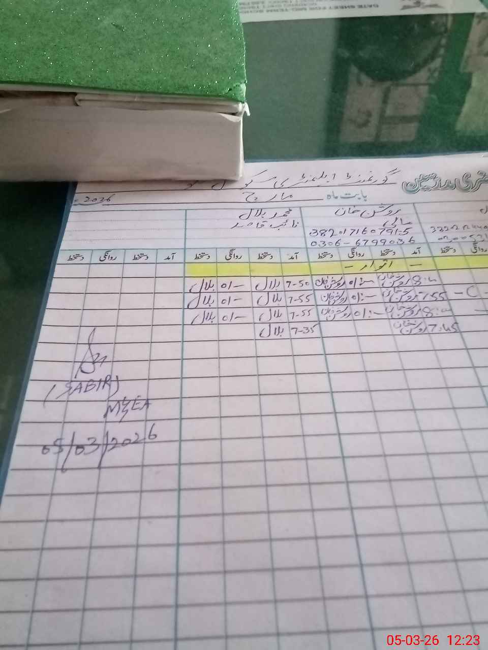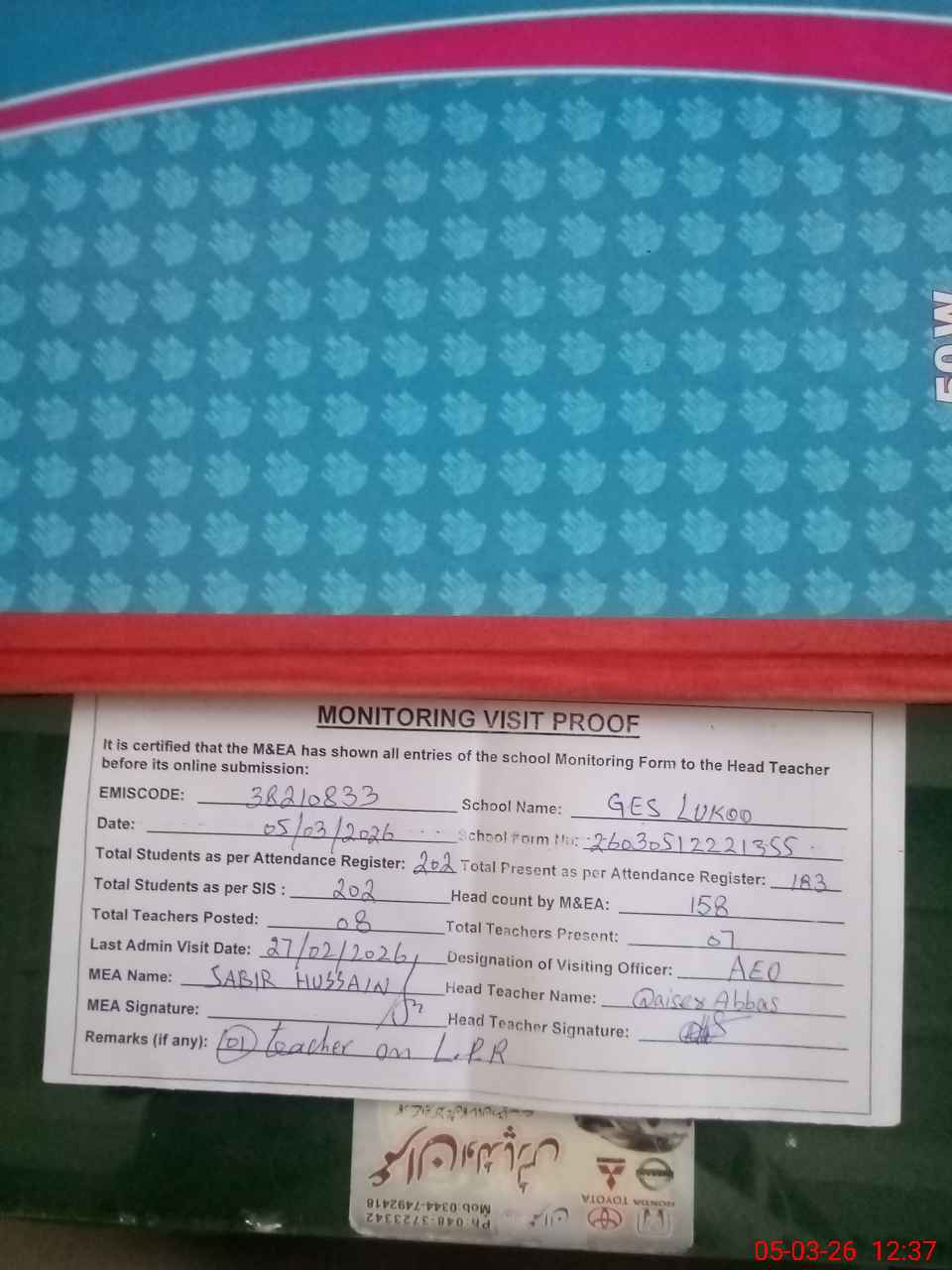 | Remarks (Use Separate Page if Required): no teacher absent total students on register 202 total students on SiS 202 last admin visit by AEO on 27 Feb 2026 | |||||