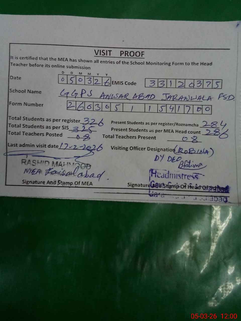 | Attendance Register | Head Teacher | MEA with School | Visit Proof |