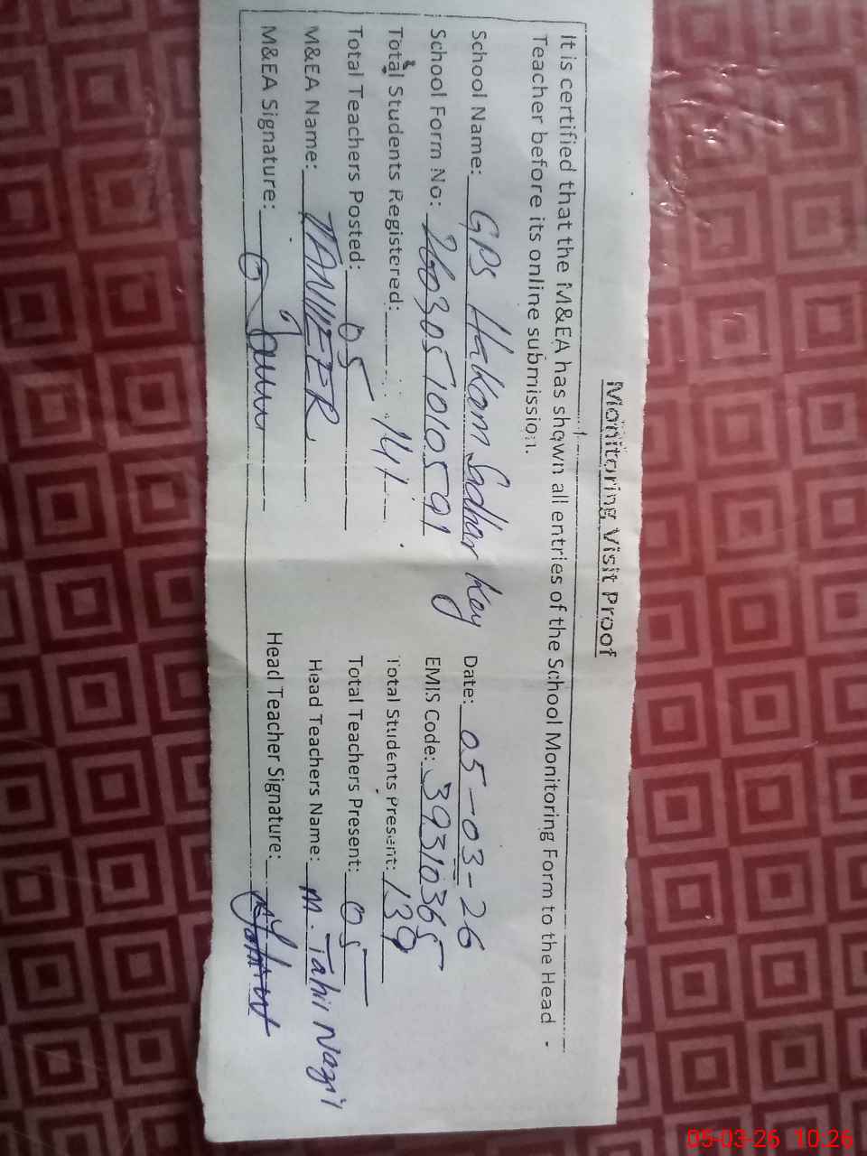 | EMIS Code: 39310365 | Name of School: GPS HAKAM SADHAR KEY | |||