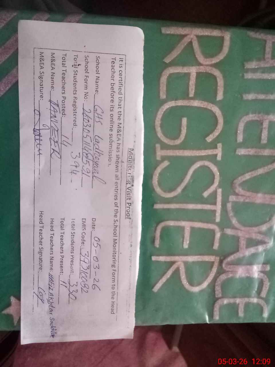 | Attendance Register | Head Teacher | MEA with School | Visit Proof |