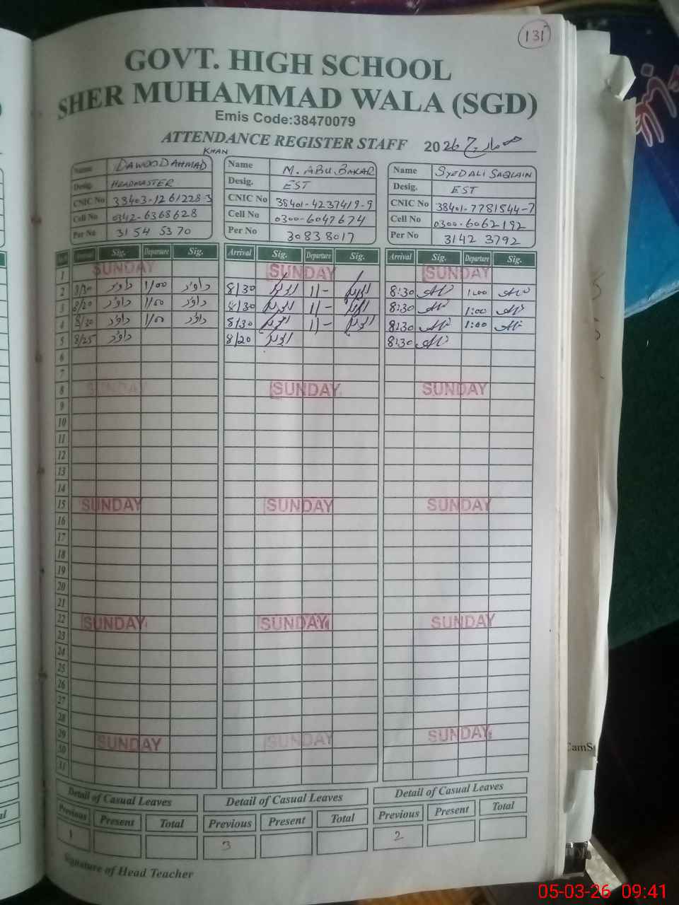 | CNIC | Full Name | Designation | R/C | Absence during last cal. month |