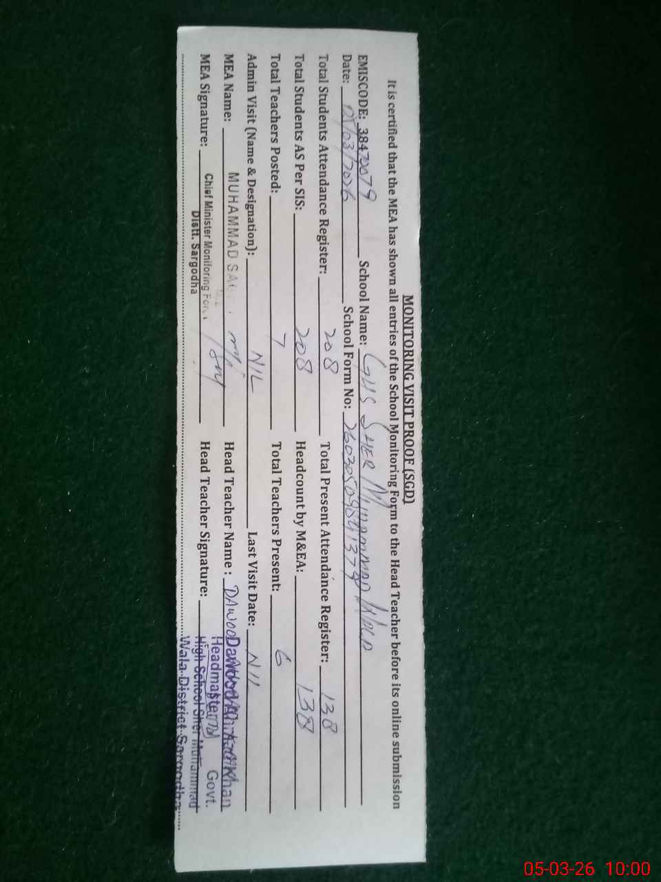 | Attendance Register | Head Teacher | MEA with School | Visit Proof |