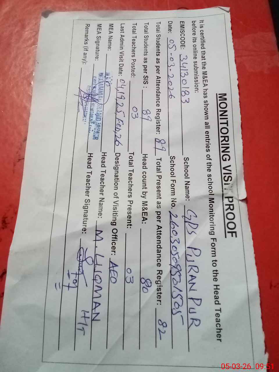 | Attendance Register | Head Teacher | MEA with School | Visit Proof |