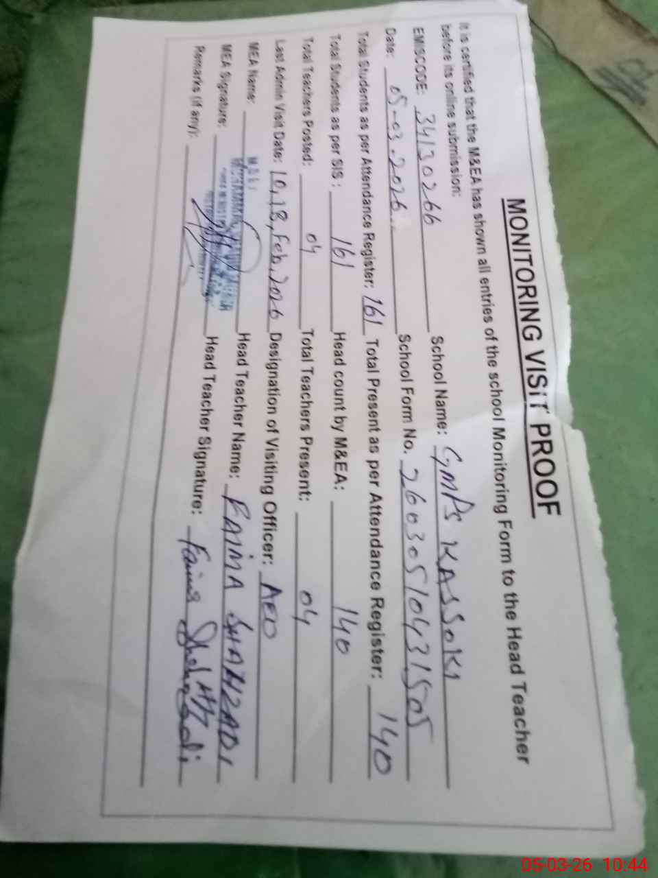 | Attendance Register | Head Teacher | MEA with School | Visit Proof |