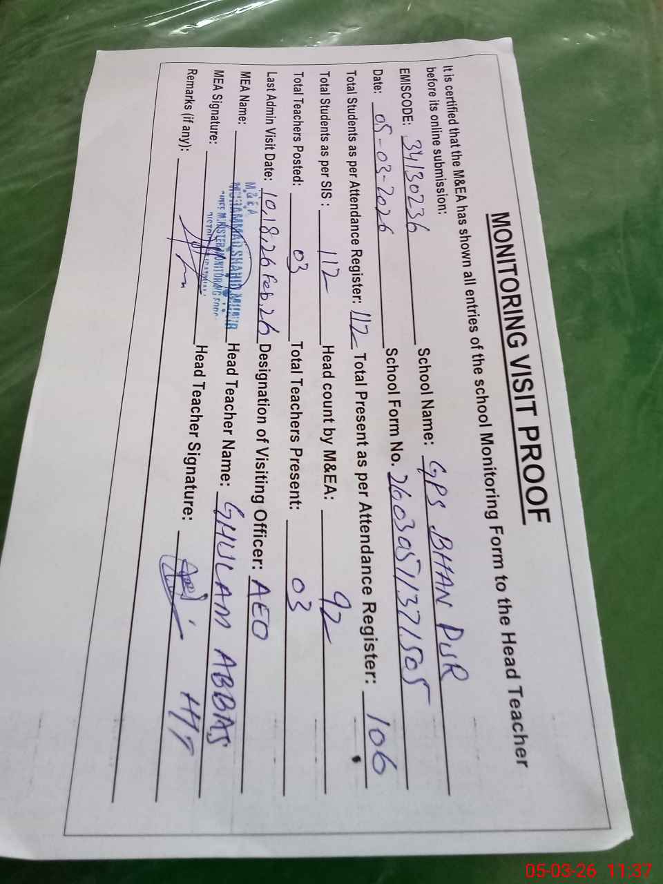 | EMIS Code: 34130236 | Name of School: GPS BHAN PUR | |||