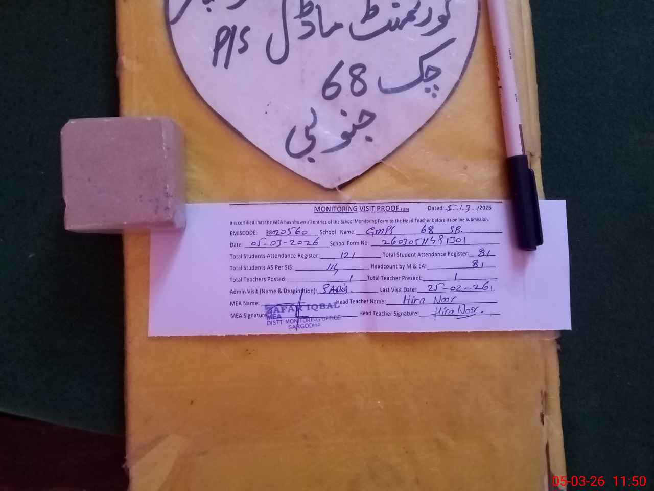 | Attendance Register | Head Teacher | MEA with School | Visit Proof |