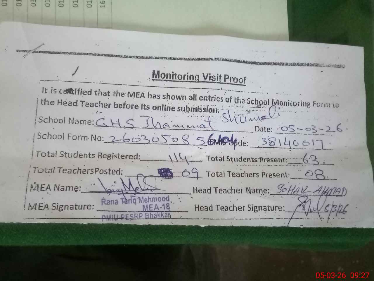 | Attendance Register | Head Teacher | MEA with School | Visit Proof |