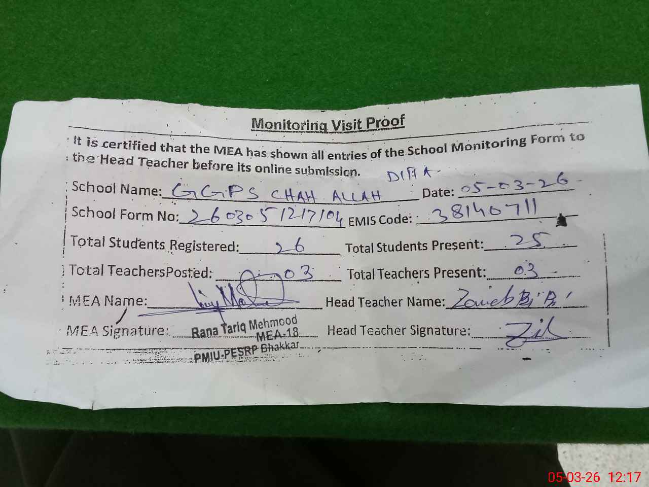 | Attendance Register | Head Teacher | MEA with School | Visit Proof |