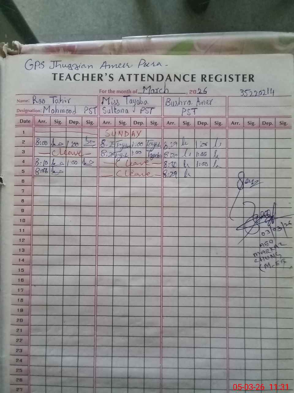 | Remarks (Use Separate Page if Required): DDEO Mubashar Iqbal visited on 10-02-26 AEO Waleed last visited on 03-03-26 Bank statements of both accounts not shown 35220214 | |||||