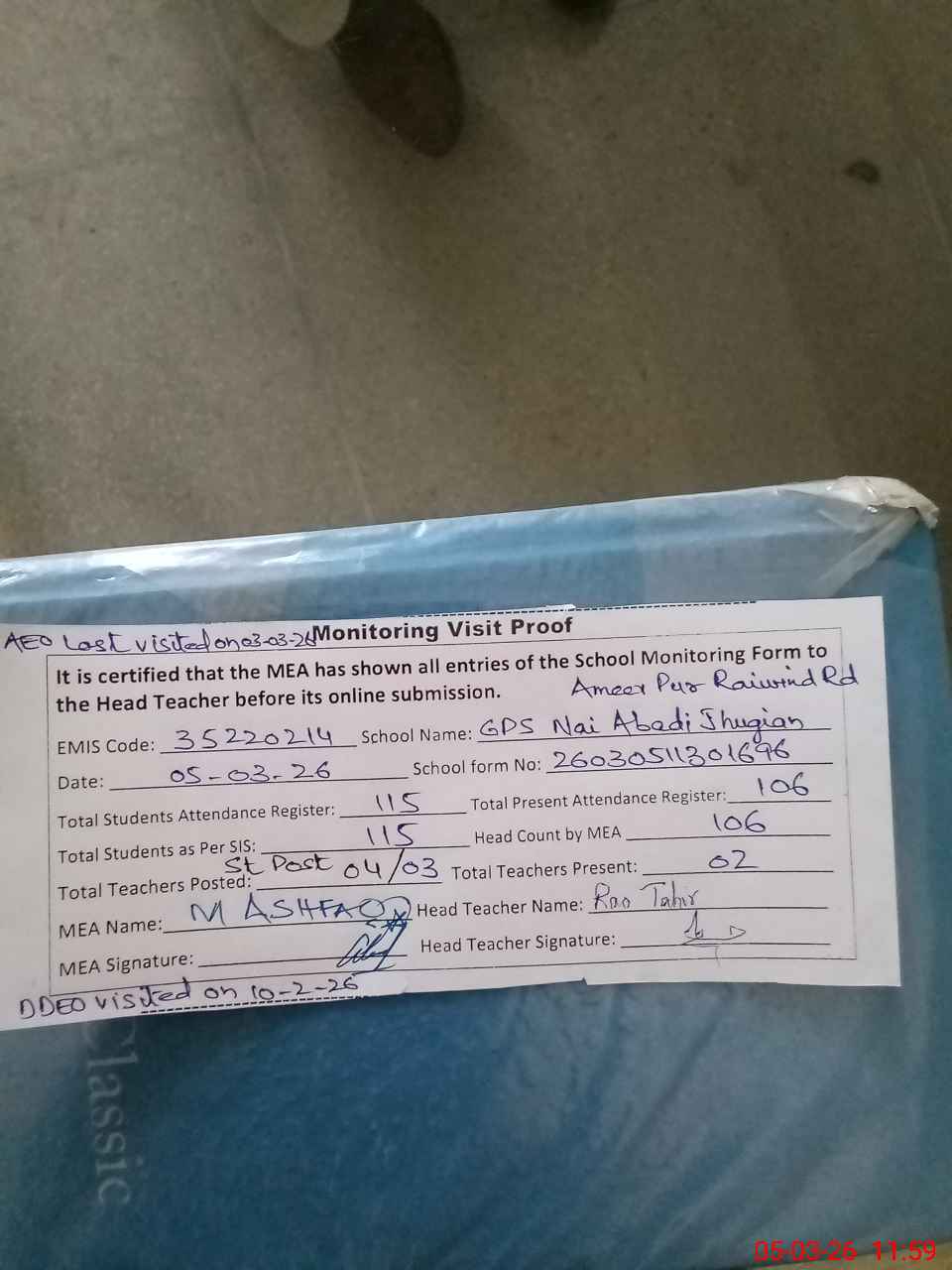 | EMIS Code: 35220214 | Name of School: GPS NAI ABADI JHUGIAN AMEERPUR RAIWIND ROAD | |||