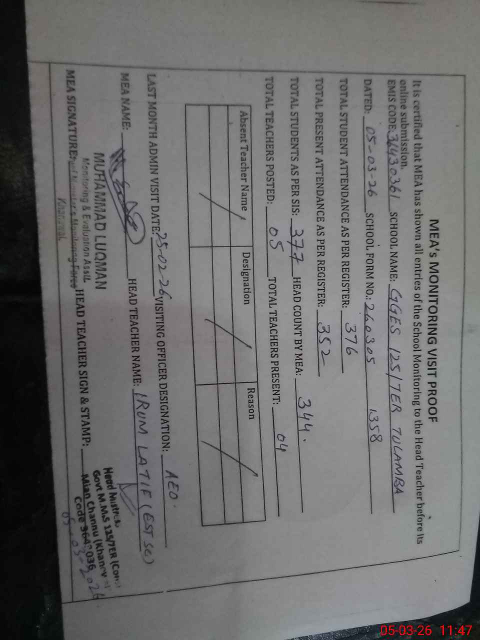 | Attendance Register | Head Teacher | MEA with School | Visit Proof |