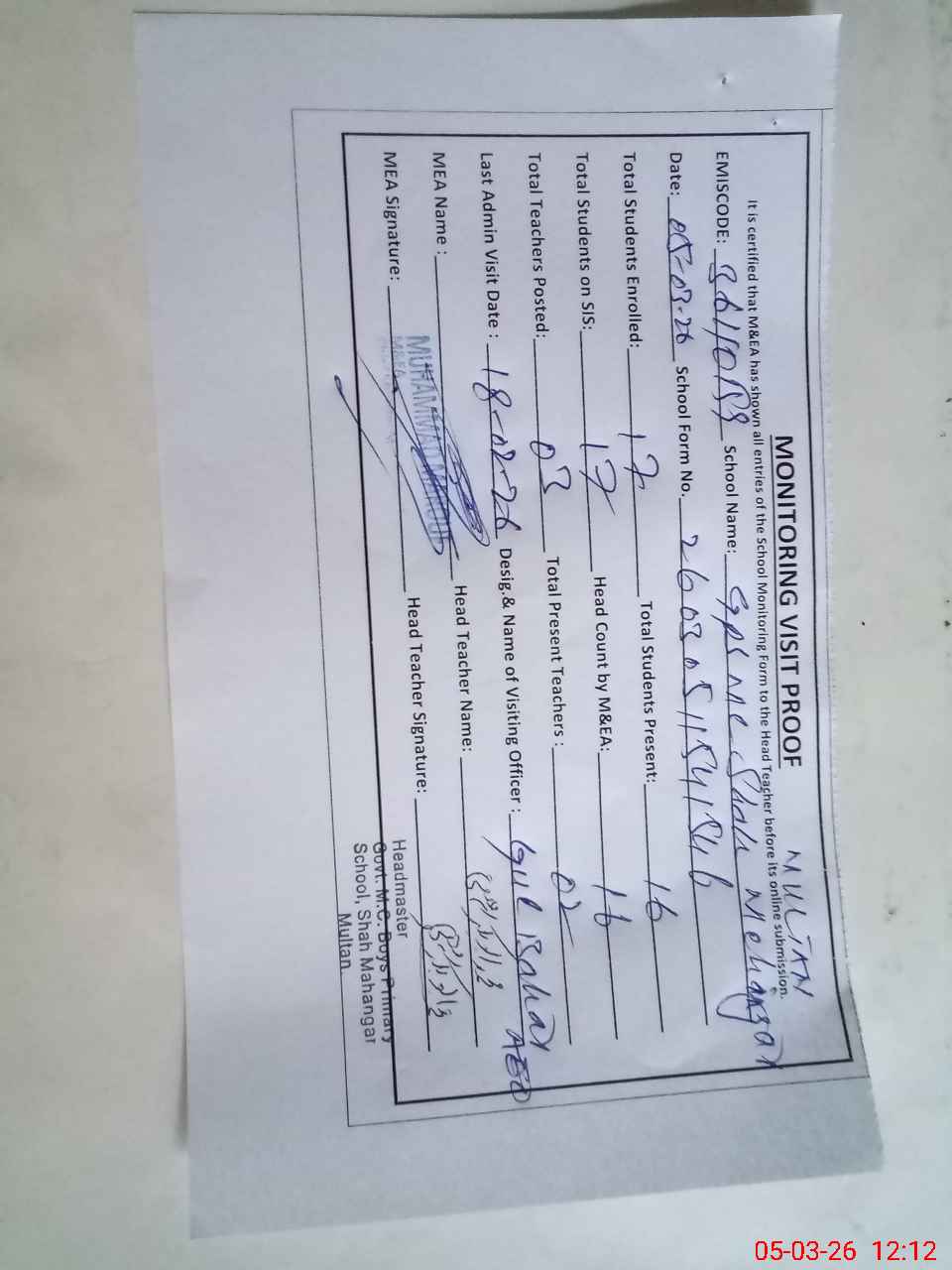 | Attendance Register | Head Teacher | MEA with School | Visit Proof |