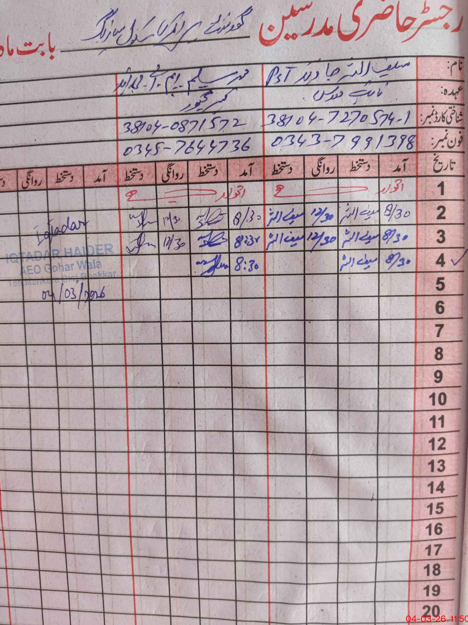 | Name: Az**** Ha**** Designation: (School Headmaster's/Headmistress's) PTC/JV Phone/Cell Number: 03**** |