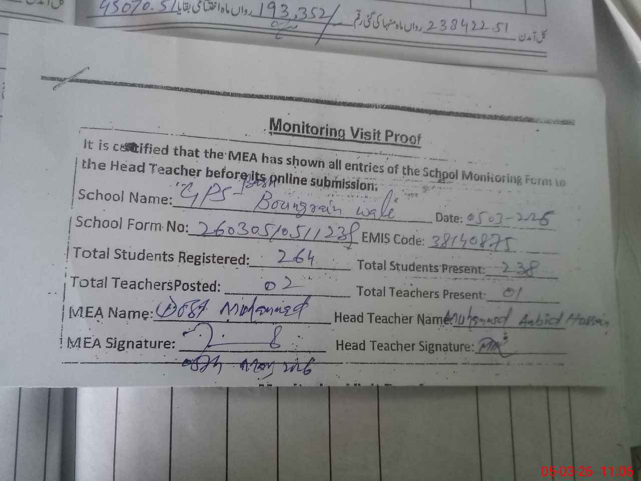 | Attendance Register | Head Teacher | MEA with School | Visit Proof |